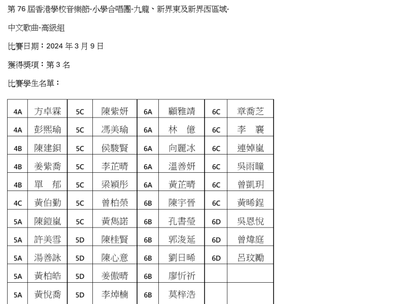 第76屆香港學校音樂節-小學合唱團_中文歌曲-高級組_第3名