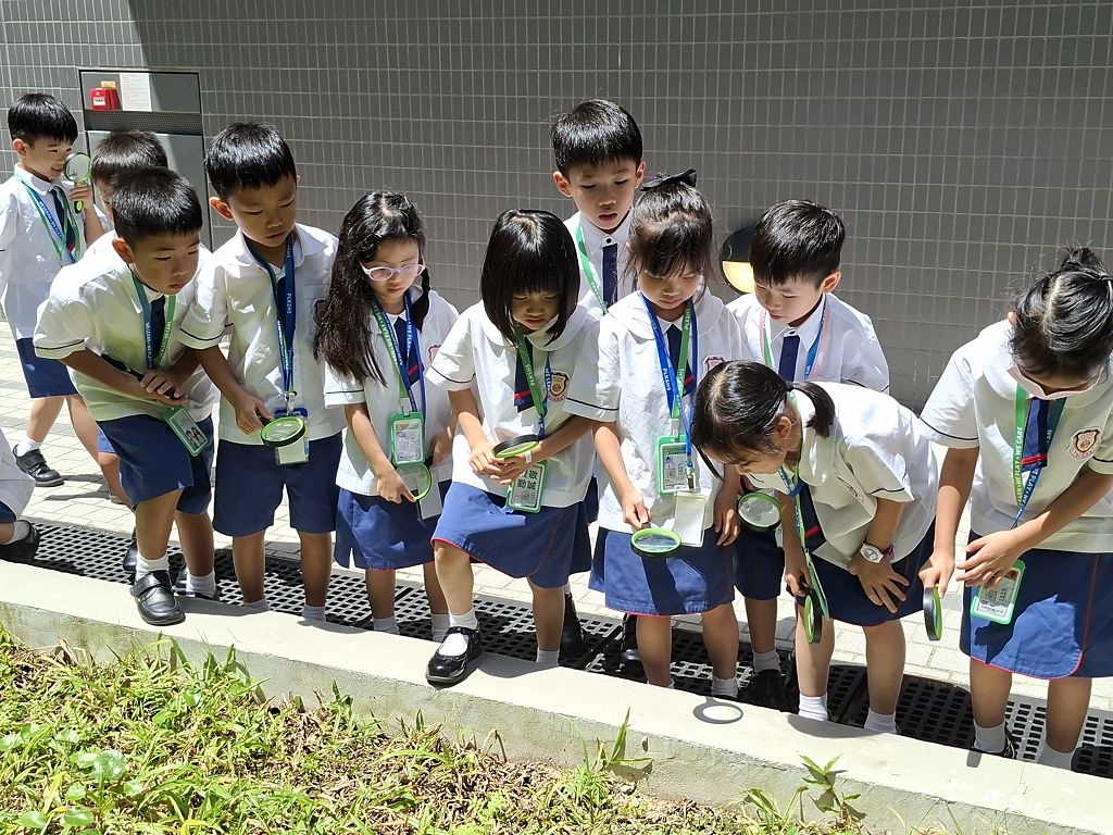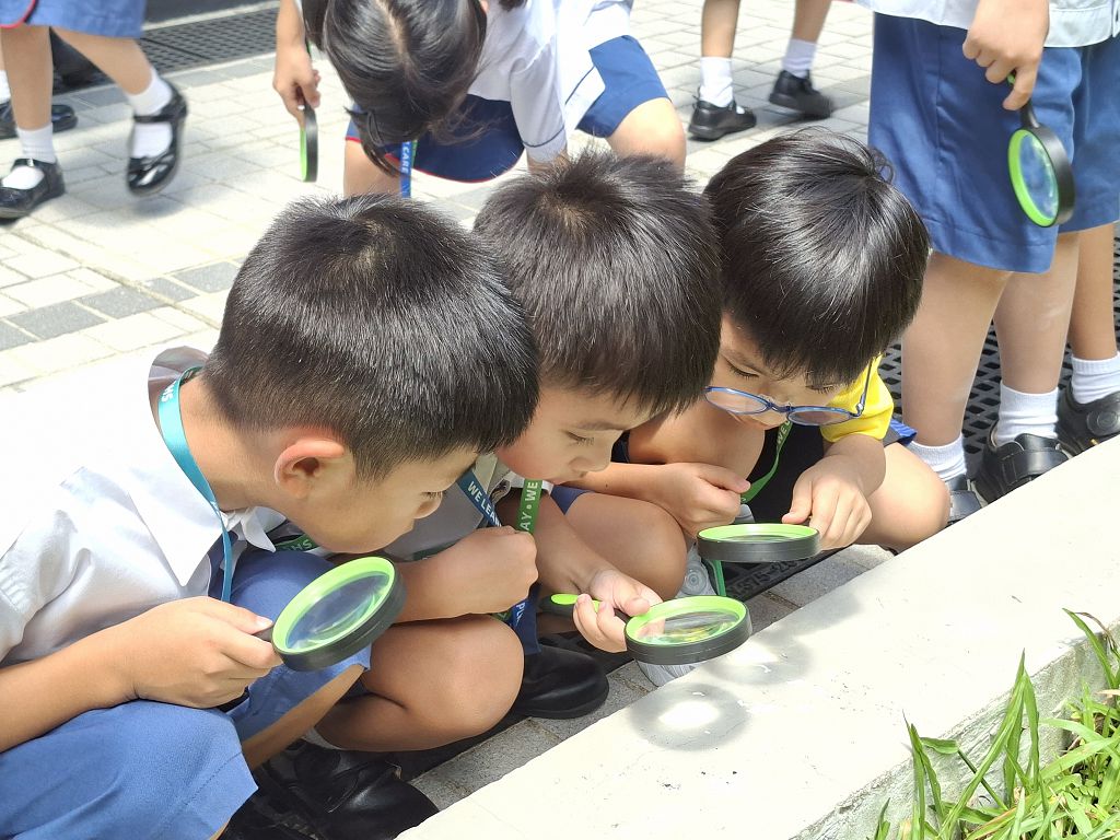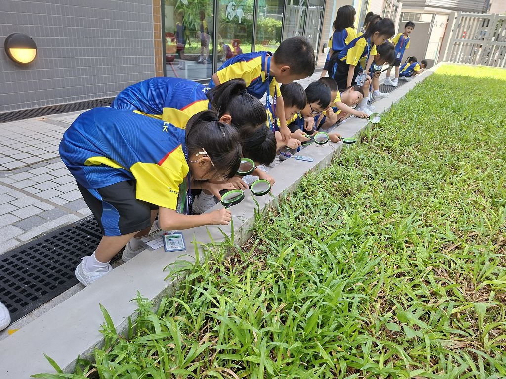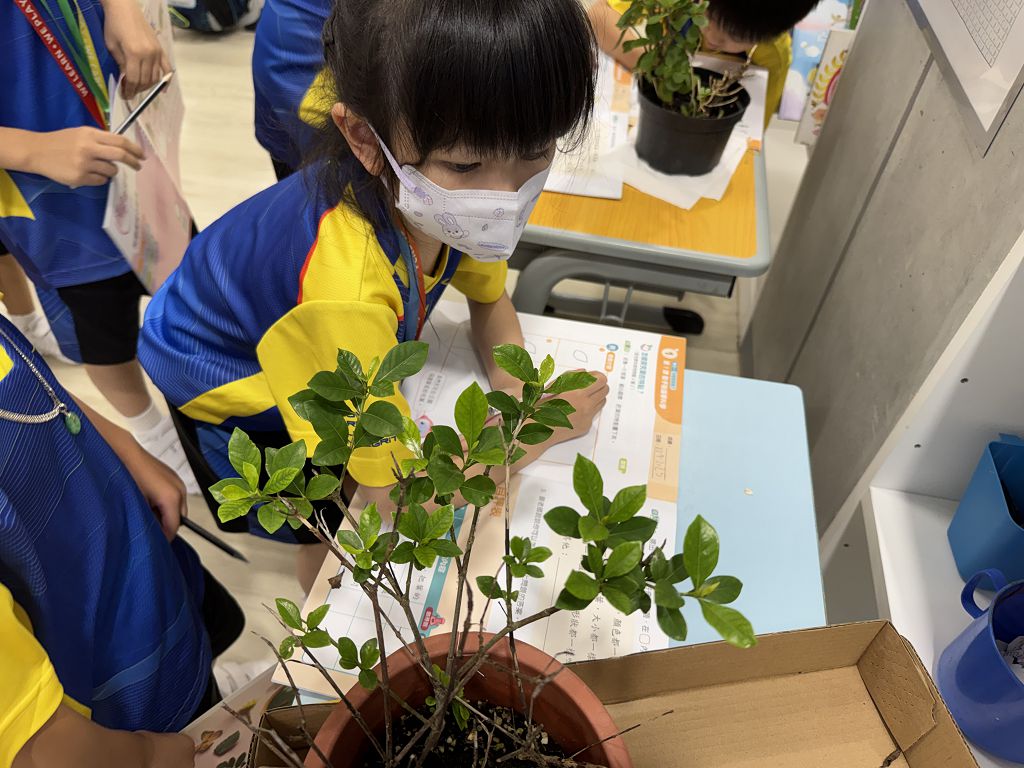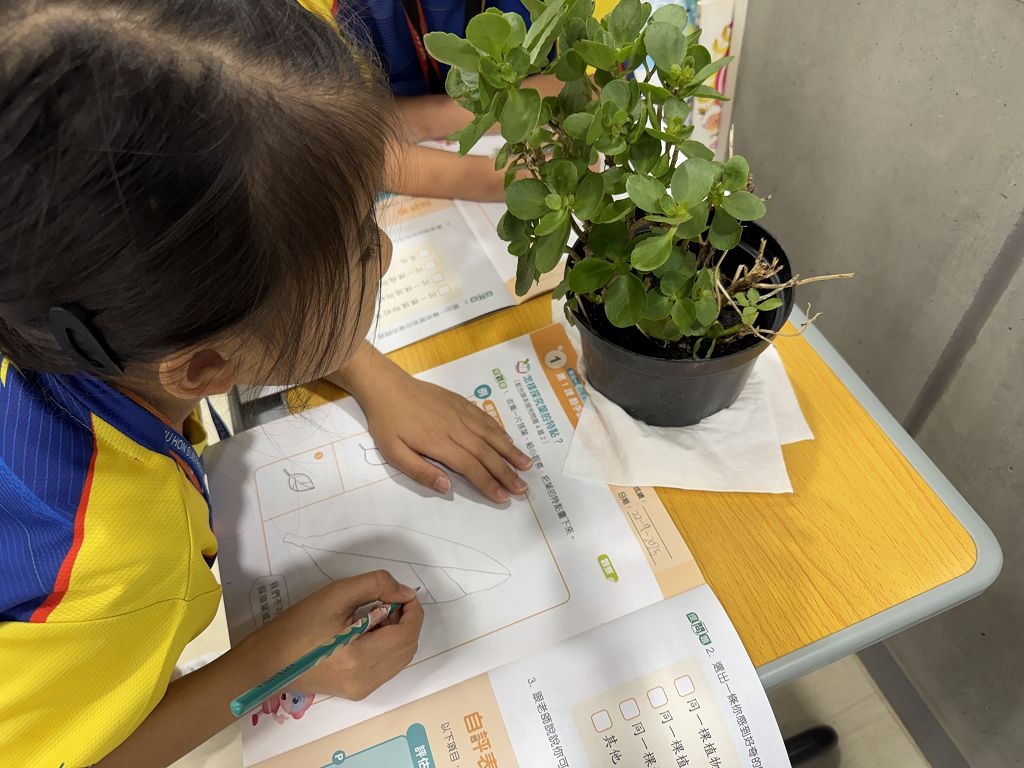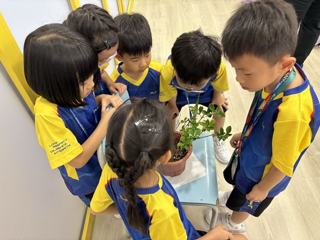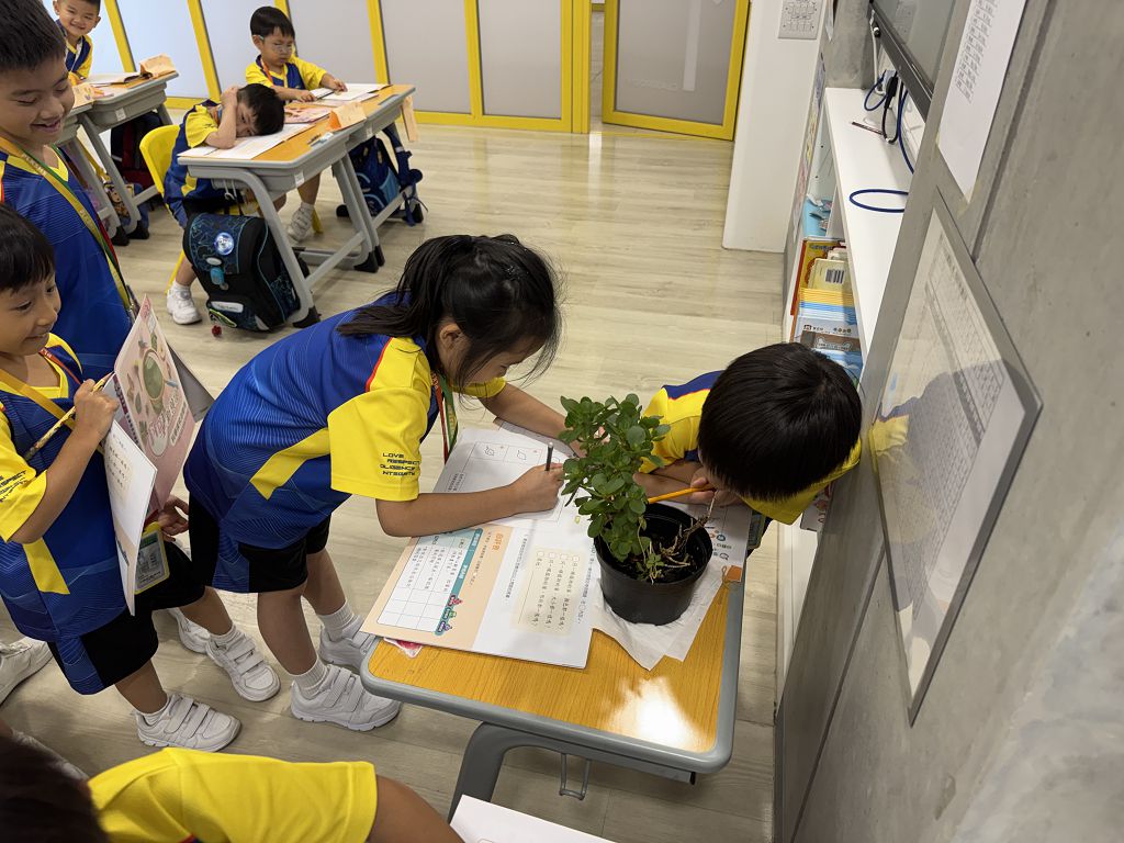 一年級科學課上,同學化身小小科學家,利用放大鏡尋找校園內的動植物。課室內亦有兩位綠色的「嘉賓」,同學都能細心觀察,在探究活動冊上畫出不同的葉,記錄不同葉子的形狀和顏色呢!