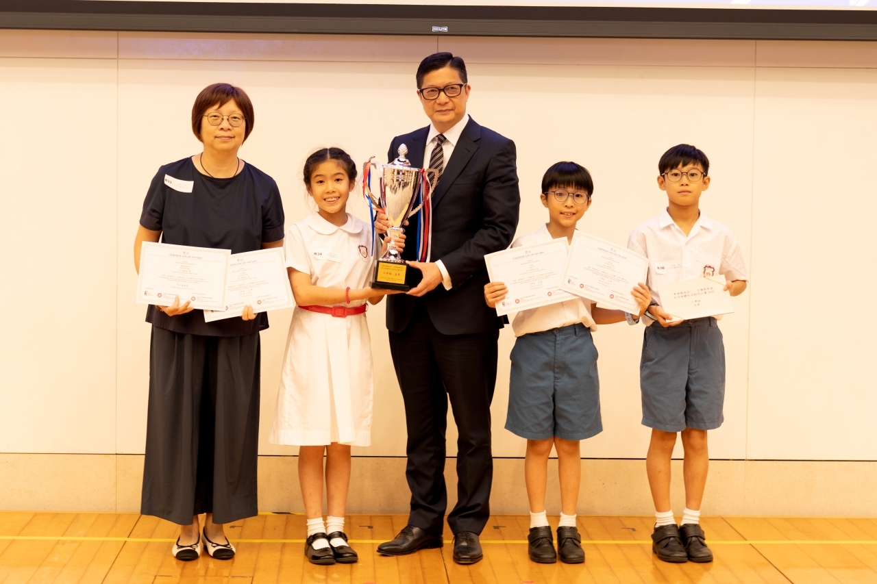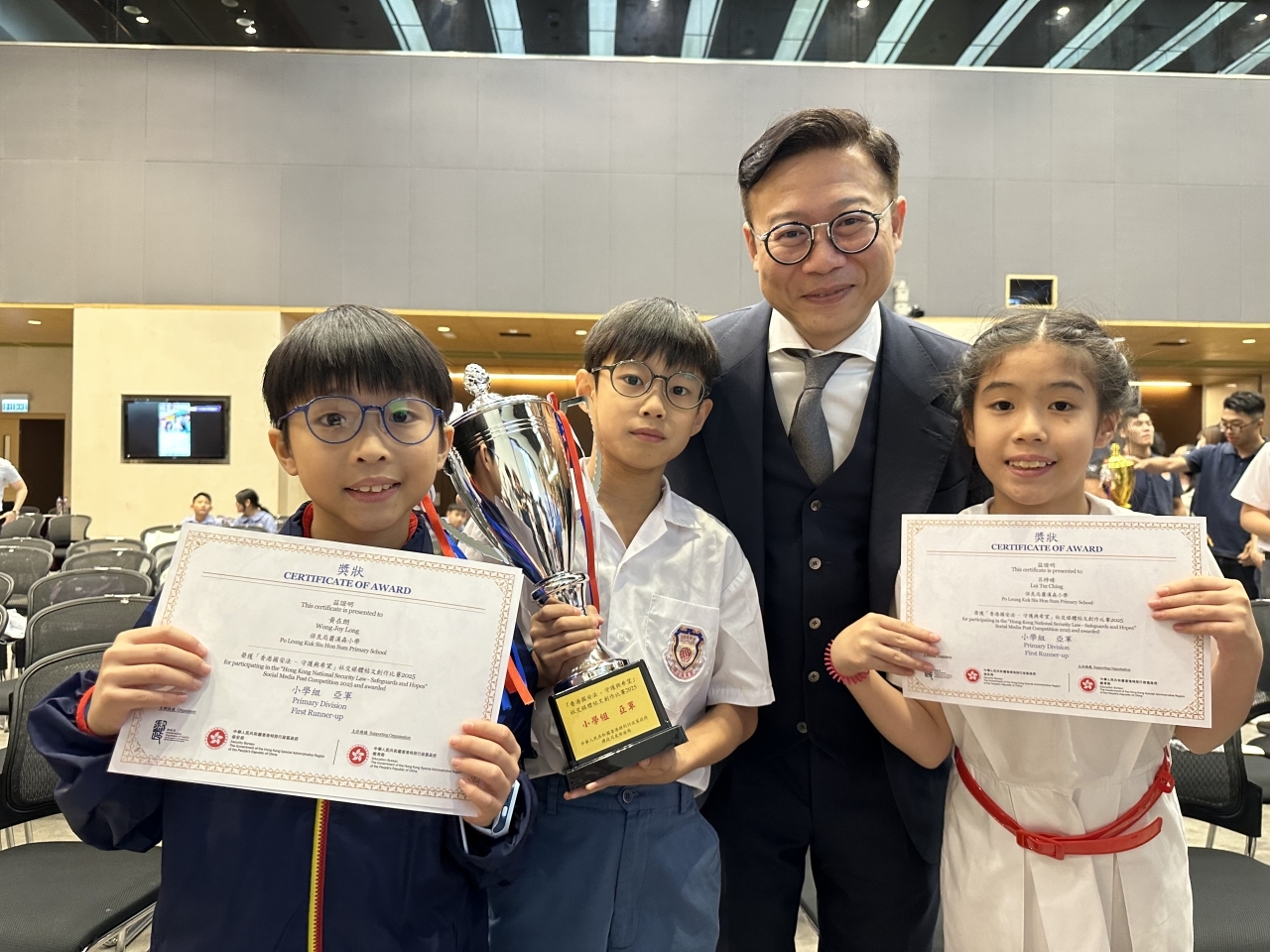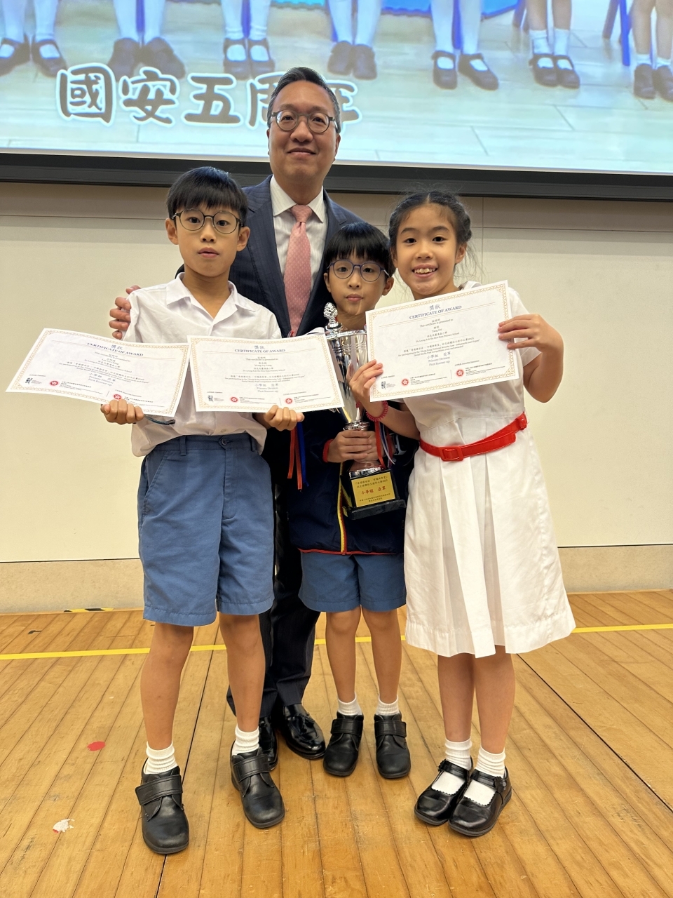 早前5位同學參加了「香港國安法 – 守護與希望」社交媒體帖文創作比賽,有幸獲得亞軍!大會於10月3日舉辦頒獎典禮,當天出席活動的有5B班的鄧斐、呂梓晴及5C班的黃在朗同學,另有已升上中學的姜傲晴與李焯楠同學,兩位當天因上學未能出席。5位得獎者獲大會頒發證書及書券獎勵,學校亦獲得傑出導師獎。再次恭喜各位獲獎同學!
