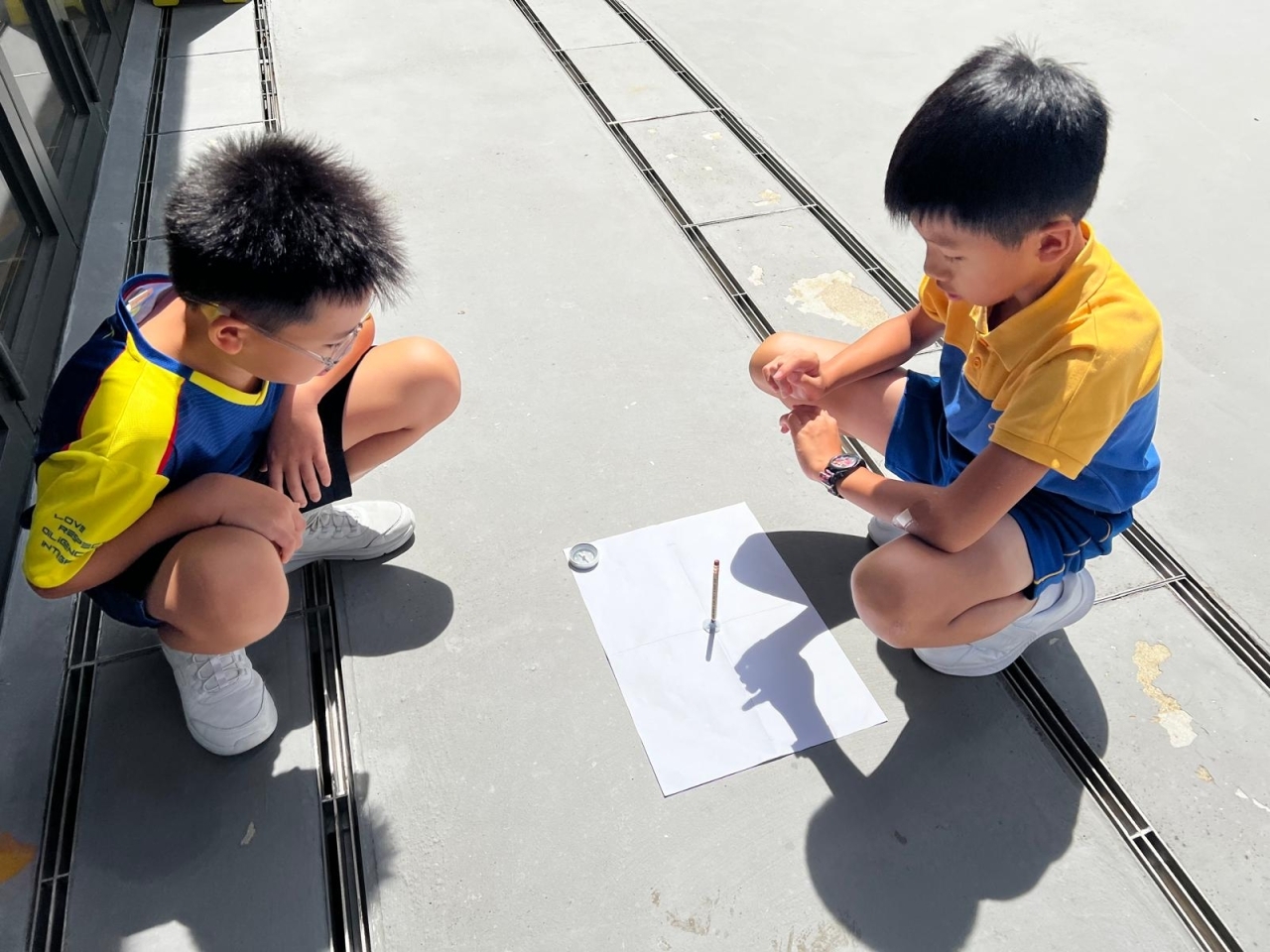 四年級科學課上,同學在校內學習地球科學,透過在戶外製作日晷,了解地球自轉產生的影子變化。